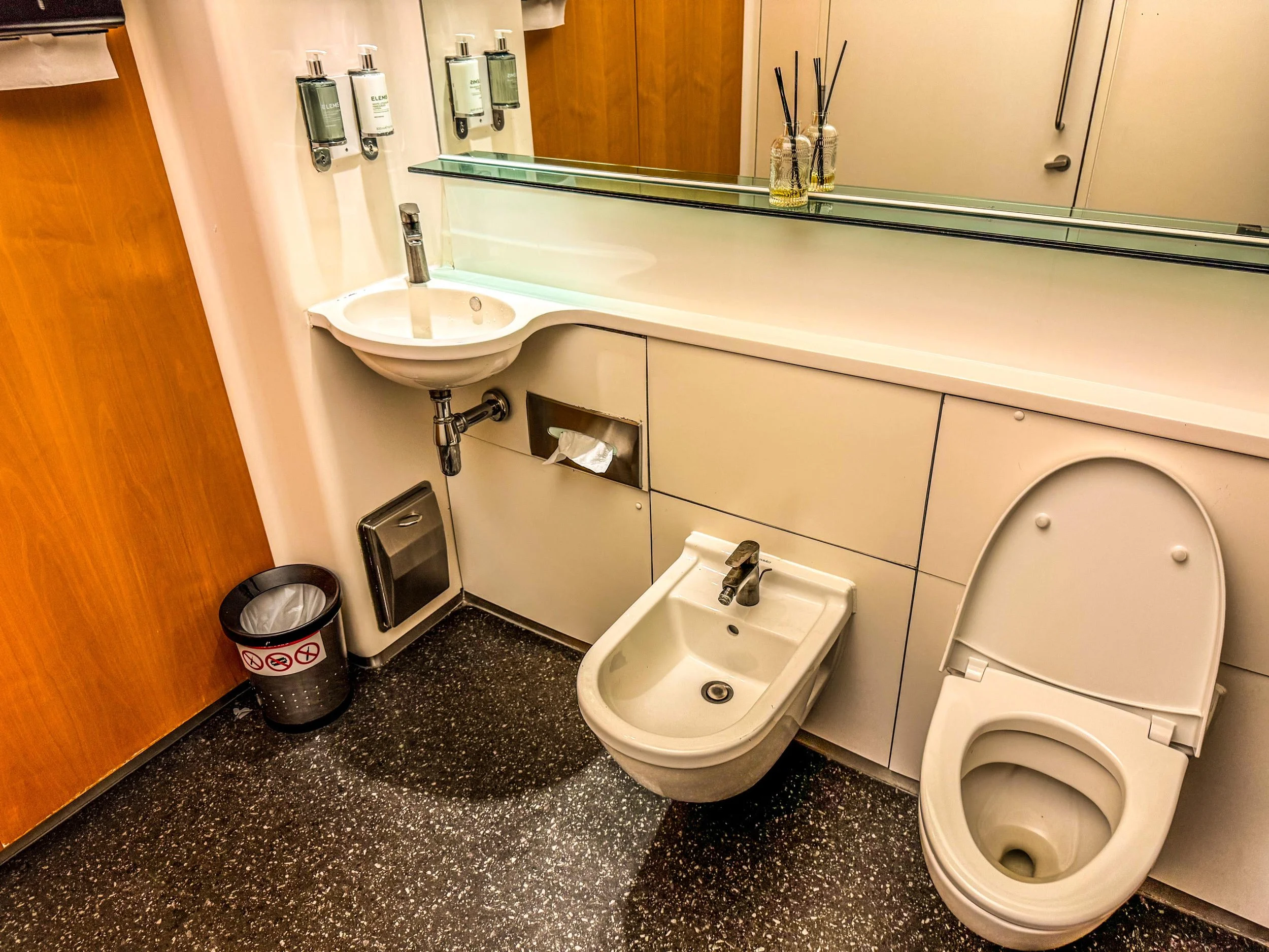 You can see that not much has changed regarding the Concorde Room bathrooms. They are constantly cleaning these bathrooms but they are very outdated. I like how they continue to carry the Elemins products soap and lotion. I find the showering area to be sterile. I think there are other lounges that have better bathrooms, but I am not using a lounge based on how a bathroom looks. That one is very low on the totem pole for me.